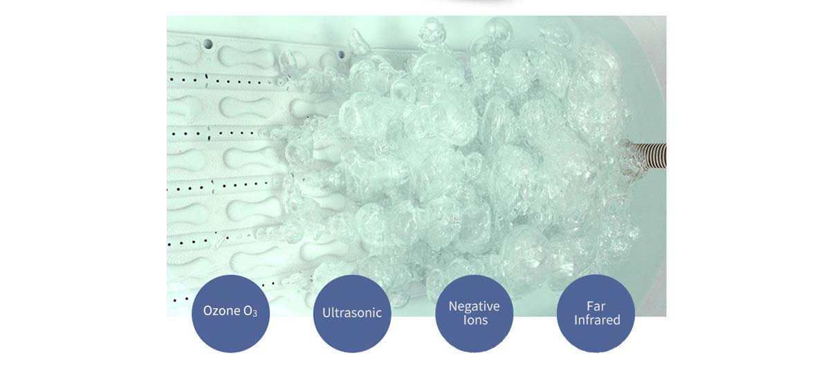 | Anions O₃ | 1 000 000 de bulles d'air chargées d'O₃ par seconde, ce qui améliore la qualité de l'eau du bain et de l'air ambiant dans la salle de bain. | NUL | NUL | NUL |