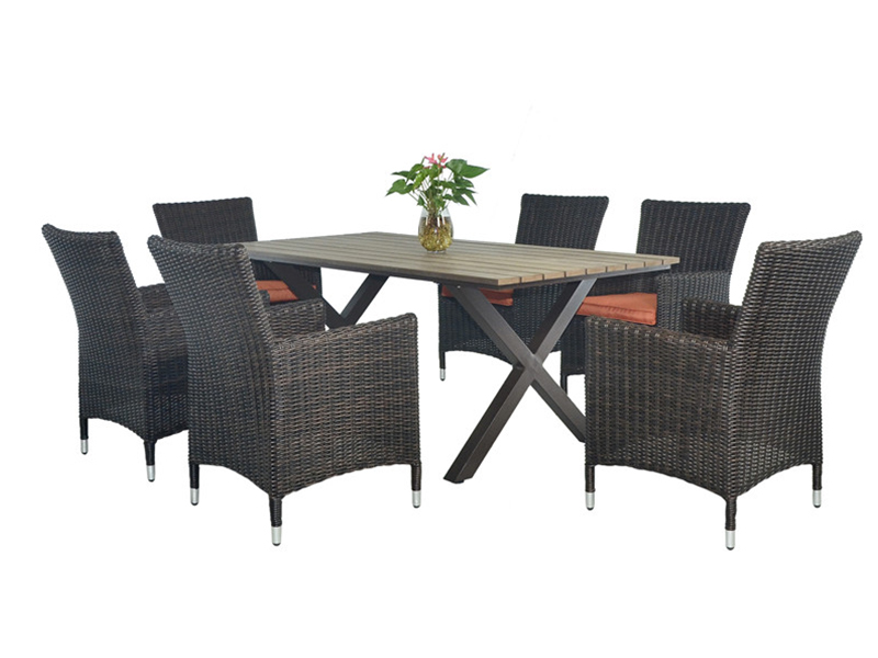 | table : L180*W90*H73cm, polywood aluminium ; chaise: L63 * W58 * H88cm, rotin PE demi-rond en aluminium, coussin de siège de 5 cm avec éponge à l'intérieur, | 184*17*93 cm/une table dans un carton ; pile de chaises | 38ENSEMBLES |