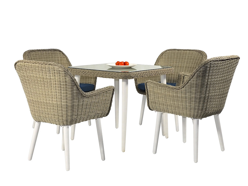 | tube d'aluminium rond et demi-rond en rotin, coussin d'assise de 5 cm avec éponge à l'intérieur, 1 table avec 4 chaises ; table : L81*L81*H72 cm ; chaise : L66,5*P61*H86 cm ; | 84*84*10 cm/1 table dans un carton ; 78*69*91 cm/4 chaises dans un carton | 123ENSEMBLES |