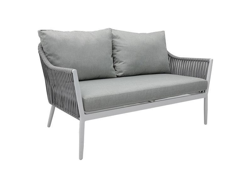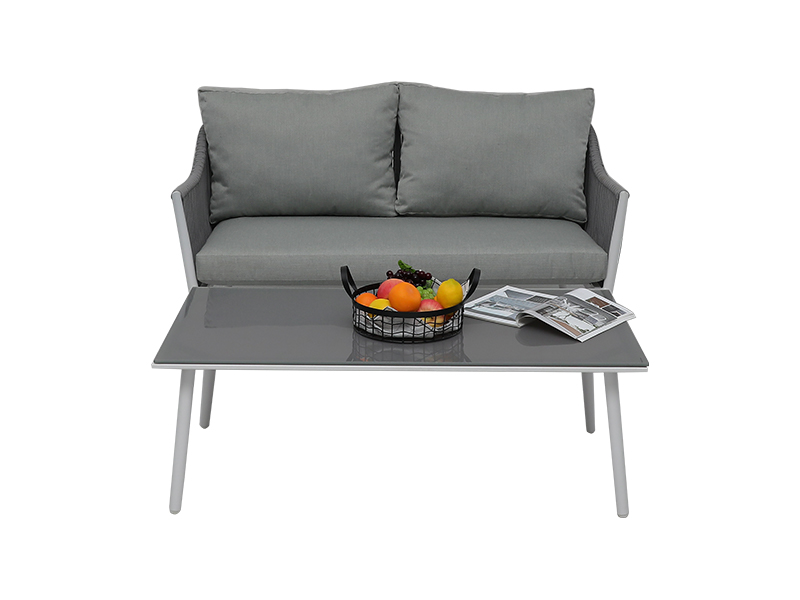 | Spécification | cadre en aluminium avec corde tissée, 4 pièces au total ; causeuse : L75*L135*H76 cm, 1 pièce chaise simple : L75*L75*H76 cm, 2 pièces table basse : L114*L60*H38,5 cm, verre gris trempé 5 mm, 1 pièce |