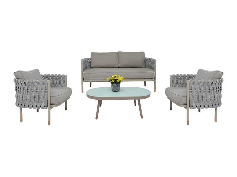 | Spécification | cadre en aluminium avec corde tissée, 4 pièces au total ; causeuse : L73*W141*H63cm, 1PC chaise simple : L73*W75*H63cm, 2PCS table basse : L100*W50*H38cm, verre blanc trempé 5mm, 1PC |