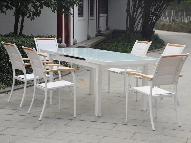 | Table d'extension : L166/216 × W95 × 78 cm, verre imprimé en soie blanche trempé de 5 mm ; Chaise : L57xP68xH94cm, bois de teck sur l'accoudoir, tissu textilène double 2*1 avec intérieur en coton | 172*101*15,5 cm/1 table dans un carton ; chaises empilées par palette | 93ENSEMBLES |