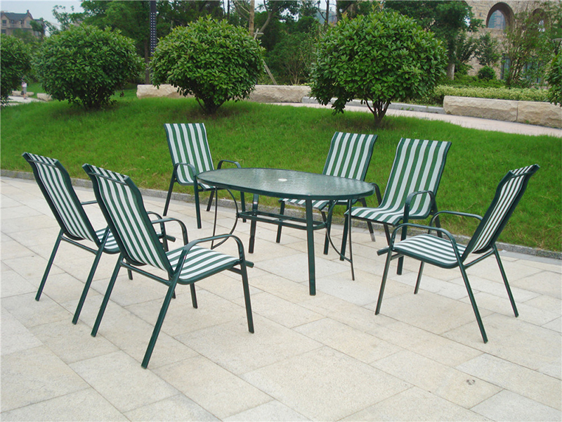 | chaise : L71W55×H95CM, tube en acier, tissu 1*1 Table : 140×90×70CM, tube en acier, verre ondulé trempé 5MM avec trou pour parapluie | 142 × 6,5 × 92 cm/1 table dans un carton, chaises empilées | 120ENSEMBLES |