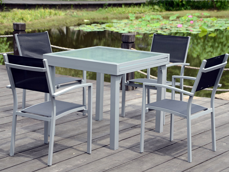 | table d'extension : L90/180*W90*H75CM, verre grillagé trempé 5 mm, tube en aluminium, vis en acier inoxydable ; Chaise:P61xL57xH87cm, alu. tube, tissu 2*1, support arrière en acier, vis en acier inoxydable ; | 92,5*12,5*92,5 cm/une table dans un carton ; 30 pièces/palette ; | 140ENSEMBLES |