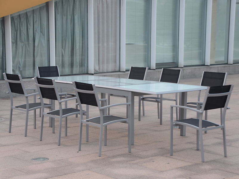 | table : L200/300*W120*H75CM, tube en aluminium, verre blanc trempé 5MM, chaise à vis en acier inoxydable : D61xW57xH87cm, tube en aluminium, tissu textile 2×1, vis en acier inoxydable | 203*14*123 cm/chaque table dans un carton ; 29 pièces/palette | 92ENSEMBLES |