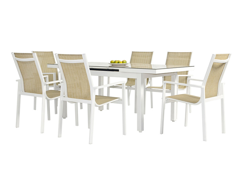 | tube en aluminium, tissu textilène 2*1, 1 table et 6 chaises ; Table d'extension : L150/190*W95*H78cm, verre imprimé en soie trempé de 5 mm ; Chaise : L67,5*L59,5*H96,5 cm | 157*100*18 cm/une table dans un carton ; 93*63*118CM/6 chaises dans un carton | 66ENSEMBLES |