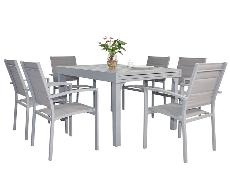 | structure en aluminium, 1 table avec 6 chaises ; table d'extension : L135/270*W100*H75CM, plateau tout en aluminium ; chaise : D61*W57*H87CM, cadre en aluminium, tissu textilène double 2*1 avec remplissage de fibres à l'intérieur, | 137,5*12,5*103 cm/une table dans un carton, 30 chaises/palette | 145ENSEMBLES |