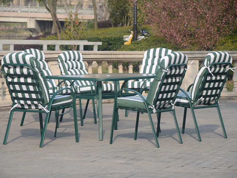 | 1 table, 6 chaises ; Table : 152 × 96 × 72 cm, tube en acier, verre ondulé trempé de 5 mm, vis galvanisée ; chaise : 71 × 57 × 91 cm, tube en acier, coussin de 10 cm avec rembourrage en fibre à l'intérieur | 154 × 7 × 98 cm/chaque table dans un carton ; chaises 25pcs/palette | 110ENSEMBLES |